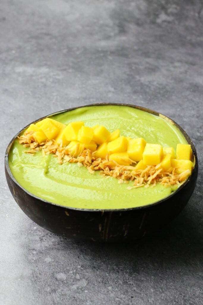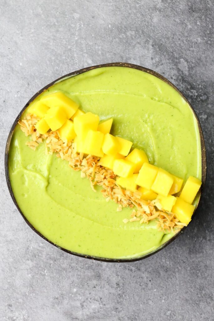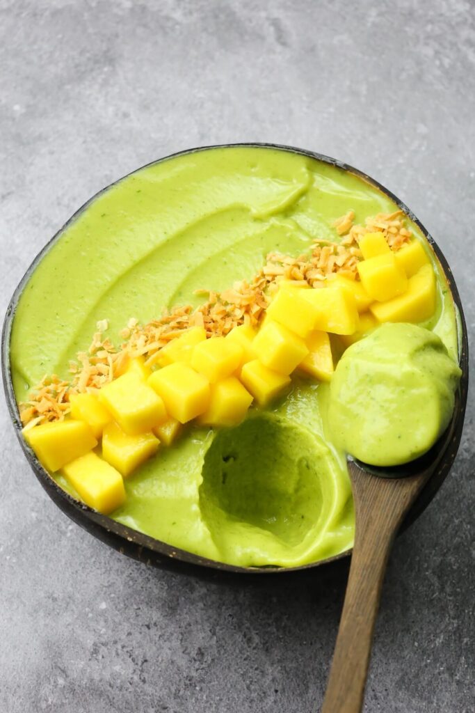 - Scoop into a bowl and add desired toppings. Serve your mango kale smoothie bowl immediately!