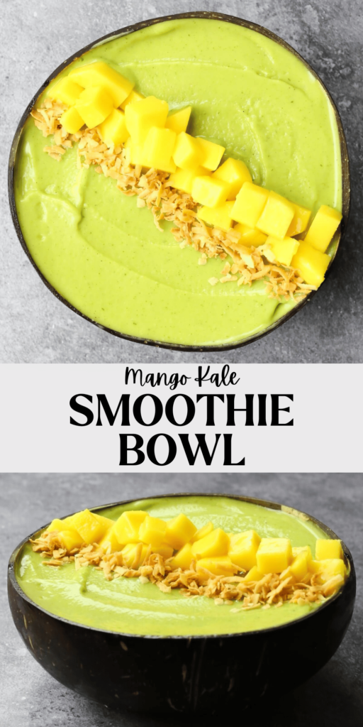 This mango kale smoothie bowl is extremely easy to make, it requires only 4 ingredients! This recipe is perfect if you love the taste of tropical mango and want to include more kale in your diet. It’s a super thick and yummy smoothie bowl without using any banana. Perfect for adding all your favourite toppings and scooping up with a spoon.