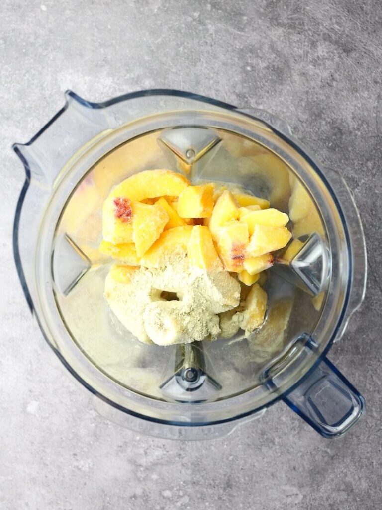 Frozen peaches & banana: The base ingredients that create the super thick consistency. Frozen peach slices can be found in most grocery stores but you can also freeze your own from fresh ripe peaches.