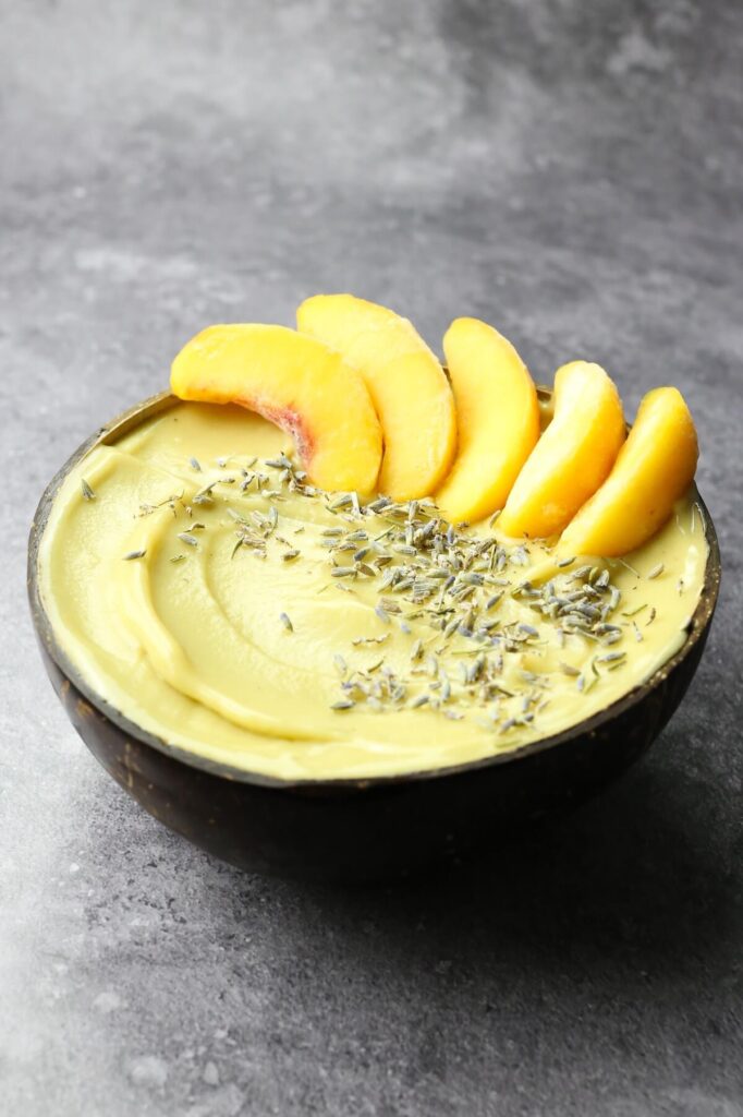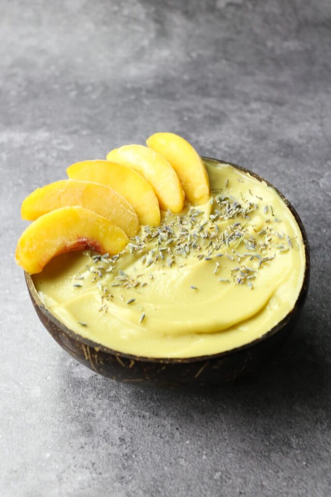 There are plenty of delicious toppings that can be added to this thick peach smoothie bowl. Fresh peach slices are an obvious choice! Toppings can be extremely healthy or more indulgent. Here are some yummy ideas: