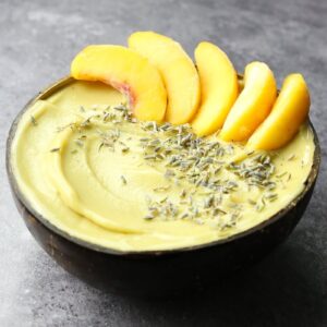This thick peach smoothie bowl is a delicious peachy alternative to the standard banana or strawberry smoothie bowl. The consistency is super thick. Almost like a sorbet, but creamier! There are 15 grams of plant protein in this smoothie bowl and the amount of protein can easily be increased (or decreased) if desired.