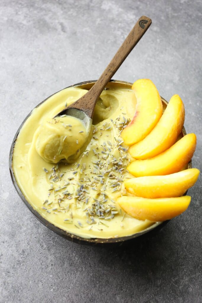 The two main ingredients for this smoothie bowl are frozen peaches and frozen bananas. Peaches have a very high water content. That’s great for smoothies, but for thick smoothie bowls it’s important to balance out water-rich ingredients with creamier ones. That’s why we will use frozen banana as well. Bananas also provide natural sweetness and encourage gut health with prebiotic fibre. The combination of frozen peach and banana is perfectly sweet, juicy and ultra thick.